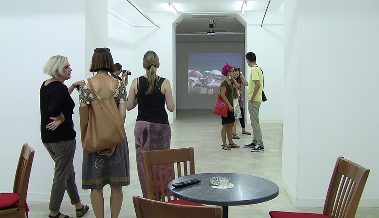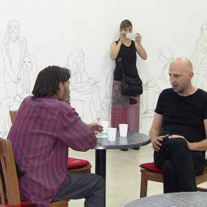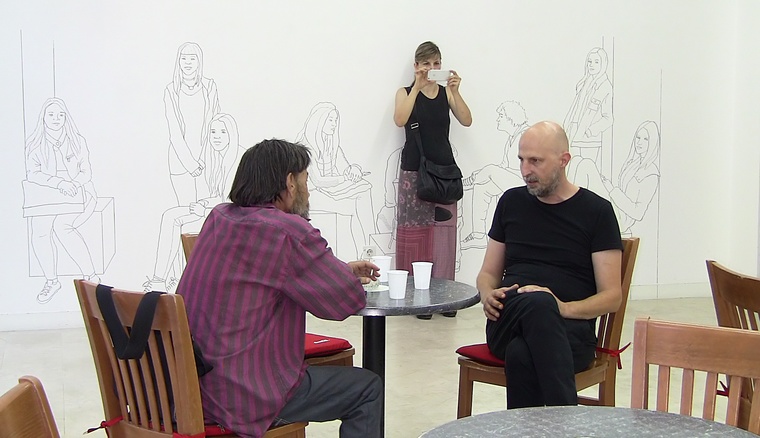 umjetnik zapali cigaretu, prošeće prostorom galerije te iziđe, ostavivši za