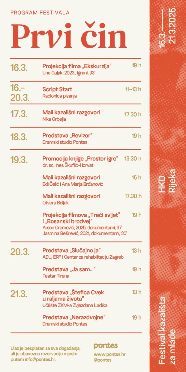 U Hrvatskom kulturnom domu na Sušaku od 16. do 21. ožujka 2026. održat će se Prvi čin – festival kazališta za mlade, u organizaciji Dramskog studija Pontes. Riječ je o novom, ali sadržajno bogatom festivalu koji publici donosi raznovrstan program namijenjen prvenstveno mladima, ali i svima koji su zainteresirani za suvremene kazalište i film.