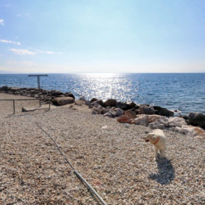 tekućom vodom, slavinom, tušem i crijevom za pranje pasa. Pristup do plaže