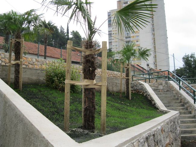 posijana trava, zasađene su tri lijepe palme, tik uz