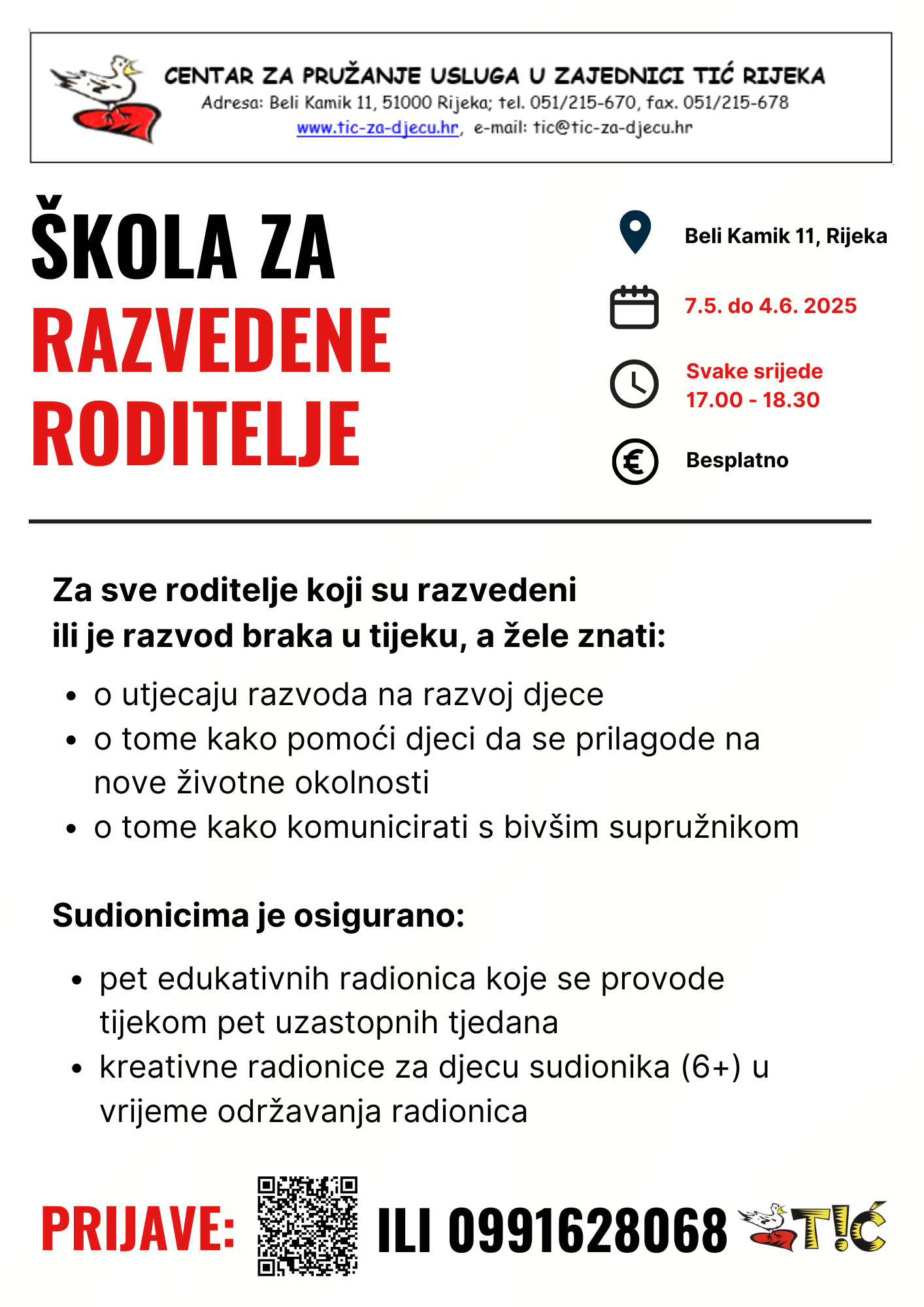 Obavezne prijave putem e-obrasca (također dostupan na Facebook stranici Centar Tić Rijeka) ili telefonom 0991628068.