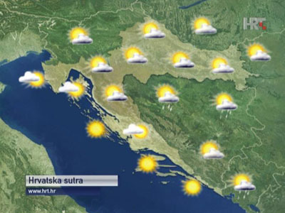 Promjenjivo oblačno sa sunčanim razdobljima i ponegdje malo kiše, a u Slavoniji i Baranji će veći dio dana prevladavati sunčano. Pretežno oblačno povremeno s kišom, pljuskovima i grmljavinom bit će prijepodne u Dalmaciji, a novo jače naoblačenje s kišom, očekuje se navečer i u noći na sjevernom Jadranu, u Gorskome kotaru, Lici i sjeverozapadnim krajevima.