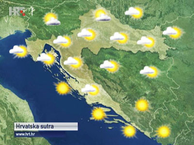 Promjenjivo oblačno sa sunčanim razdobljima i ponegdje malo kiše, a u Slavoniji i Baranji će veći dio dana prevladavati sunčano. Pretežno oblačno povremeno s kišom, pljuskovima i grmljavinom bit će prijepodne u Dalmaciji, a novo jače naoblačenje s kišom, očekuje se navečer i u noći na sjevernom Jadranu, u Gorskome kotaru, Lici i sjeverozapadnim krajevima.