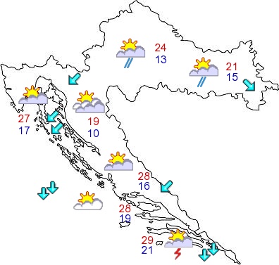 Najniža jutarnja temperatura zraka između 10 i 15, na Jadranu 16 i 21, a najviša dnevna od 19 do 24, na Jadranu od 25 do 30 °C.