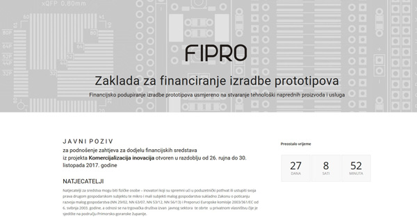 Zaklada FIPRO i Primorsko-goranska županija (Upravni odjel za turizam, poduzetništvo i ruralni razvoj) zajedno će dodijeliti do 520.000 kuna fizičkim osobama koje namjeravaju osnovati poduzeće te mikro i malim poduzećima kroz projekt Komercijalizacija inovacija. Ovih dana Zaklada je objavila drugi Javni poziv u 2017. godini za podnošenje zahtjeva za dodjelu  financijskih sredstava, nakon što je prethodnim, u suradnji s Gradom Rijeka, već dodijeljeno oko 175 tisuća kuna bespovratnih sredstava.