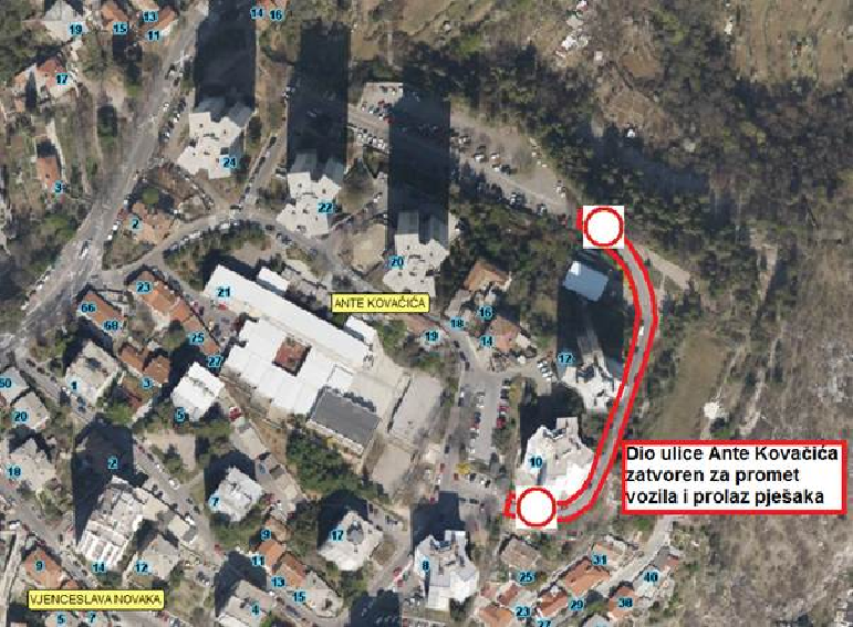 Fotografija: Prikaz dijela Ulice Ante Kovačića koji je zatvoren za promet vozila i prolaz pješaka