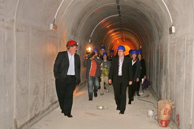 Prvi pješački izlaz je gotov u to su se mogli uvjeriti i novinari Gradonačelnik Obersnel je na ulazu u tunel dao novinarima kraću izjavu u kojoj je naglasio da za neotvaranje ceste nema razumnog objašnjenja. Najžalosnije je to da su tunel i cesta gotovi, a pješački se izlazi valjda još kopaju, kazao je Obersnel. Novinari su se obilaskom istog mogli uvjeriti da je barem prvi pješački izlaz definitivno dovršen.